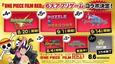 『ONE PIECE FILM RED』 6大アプリゲームコラボの後半3タイトル発表! 第4弾:モンスターストライク 8月20日(土)開始! 第5弾:パズル&ドラゴンズ 9月1日(木)開始! 第6弾:グランブルーファンタジー 9月...